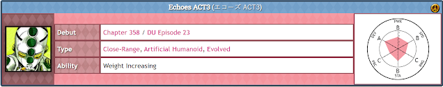 Echoes Echoes has the unusual ability to take on three distinct forms, ACT1, ACT2 and ACT3, which Koichi may call upon alternately. Each form allows the use of a different ability, such as generating sound effects or applying weight to a target.